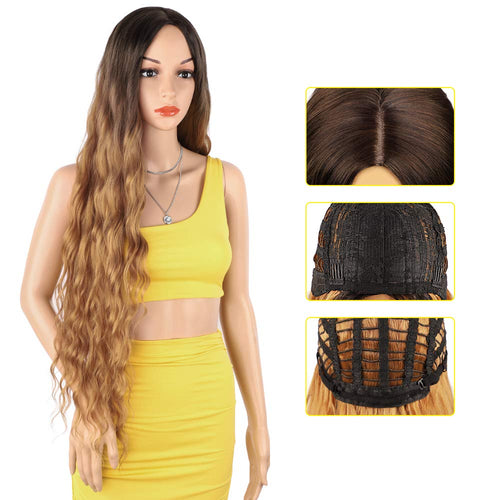 FORCUTEU 38” Long Curly Wig Middle Part Black Color Super Long Water Wavy Ripple Synthetic Hair Wig Soft Wavy Fluffy Curly Wig Heat Resistant