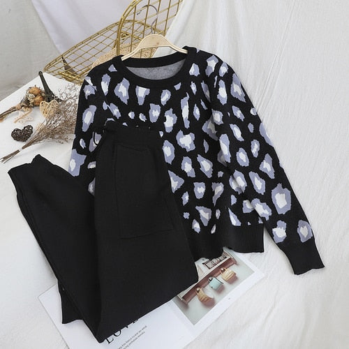 Sweatsuits Knitted Leopard Long Sleeve O-neck Sweater + Elastic Waist Pocket Harem Pants Sets