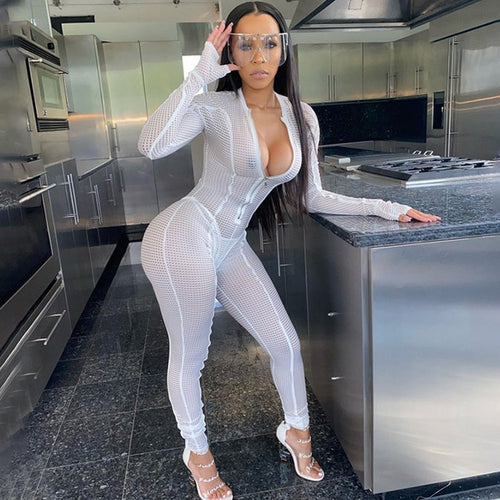 Sheer Mesh Plaid Sexy Jumpsuit for Women Front Zip V Neck Long Sleeve Romper Party Night Club Rompers Womens Jumpsuit Body Suit